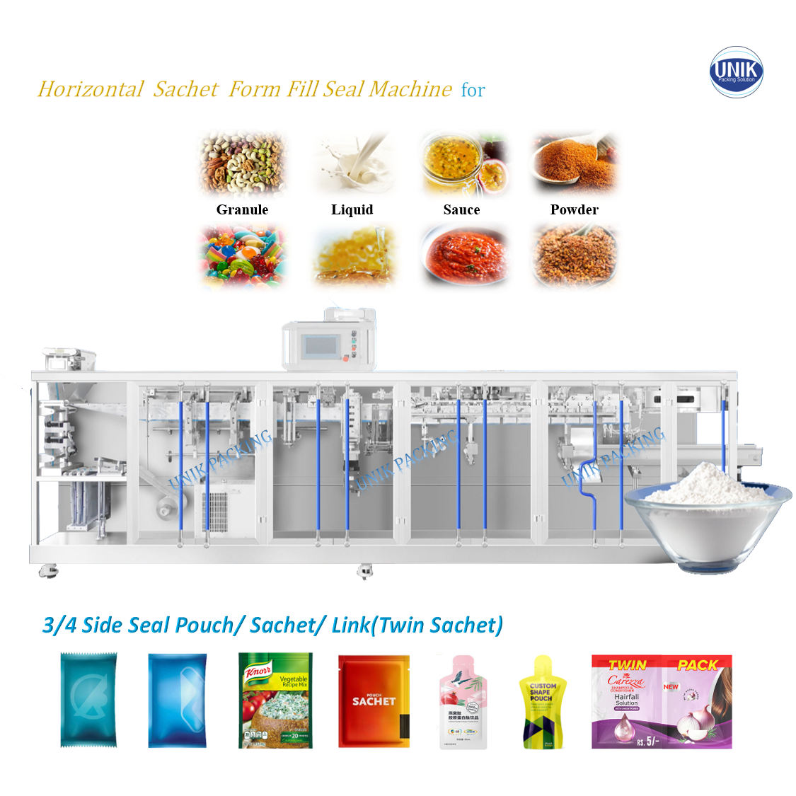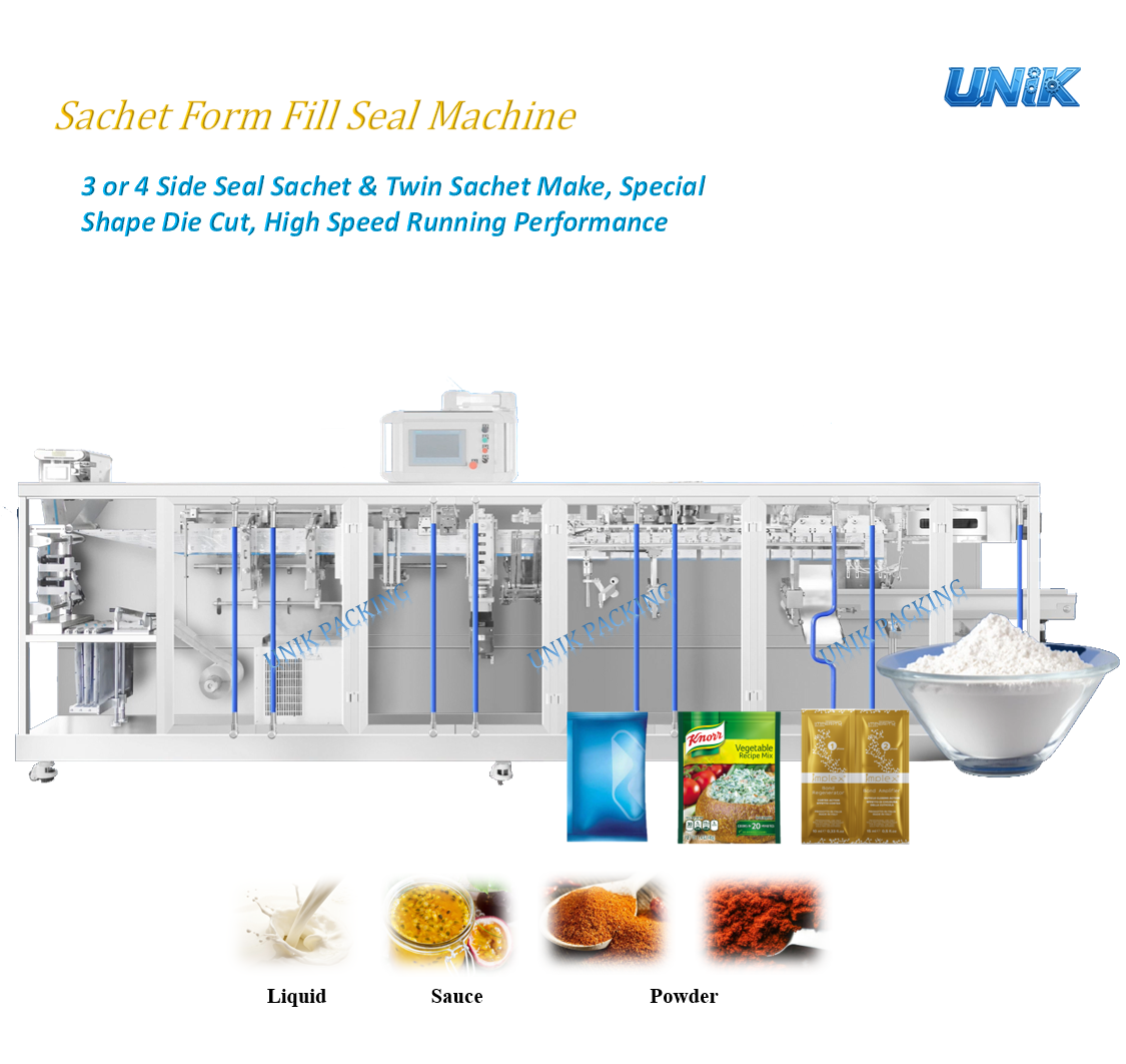 Sachet Form Fill Seal Machine includes Film Releasing structure, Film Pulling mechanism, Bag Forming mechanism, Cutting structure, Filling mechanism, Hot Sealing, Cold Sealing and Shaping mechanism, and other mechanisms.